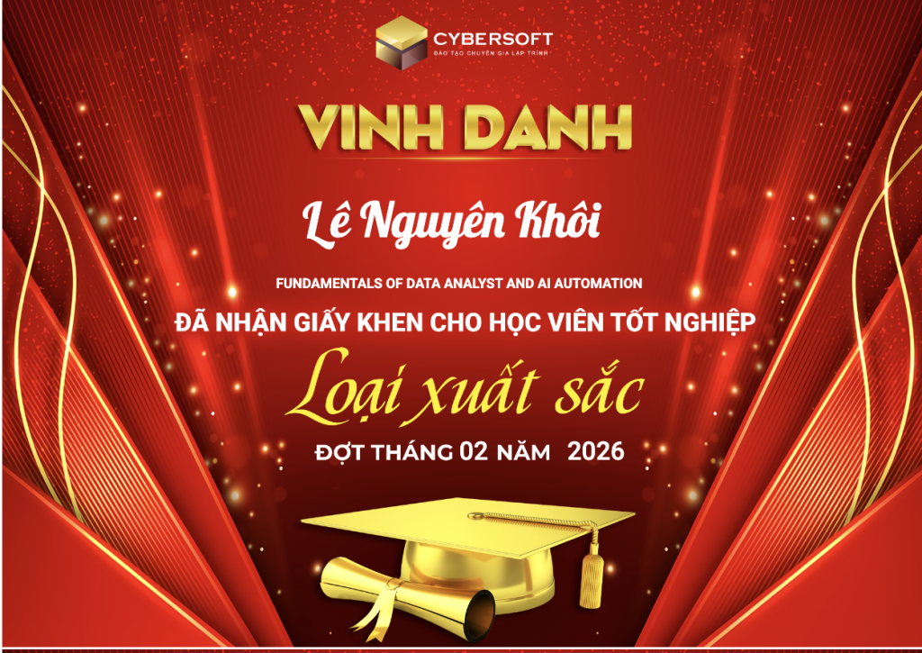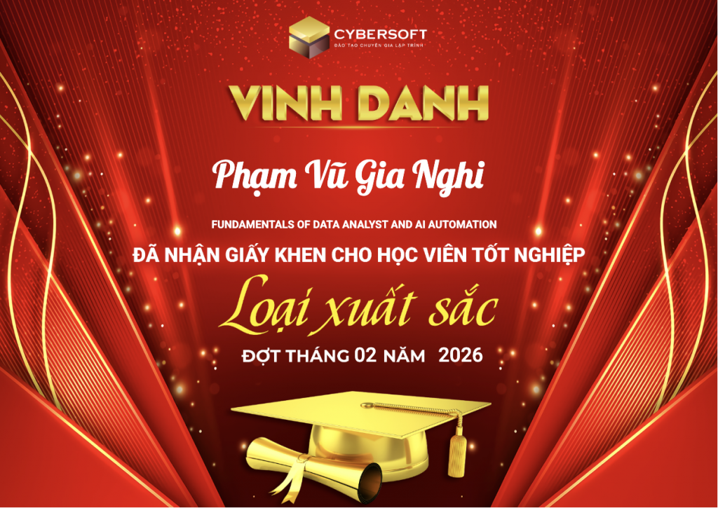 CyberSoft trân trọng chúc mừng các học viên đã hoàn thành khóa học với xếp loại Xuất Sắc. Đây không chỉ là kết quả của sự chăm chỉ, mà còn là minh chứng cho tinh thần kỷ luật, ý chí bền bỉ và khát khao phát triển bản thân.