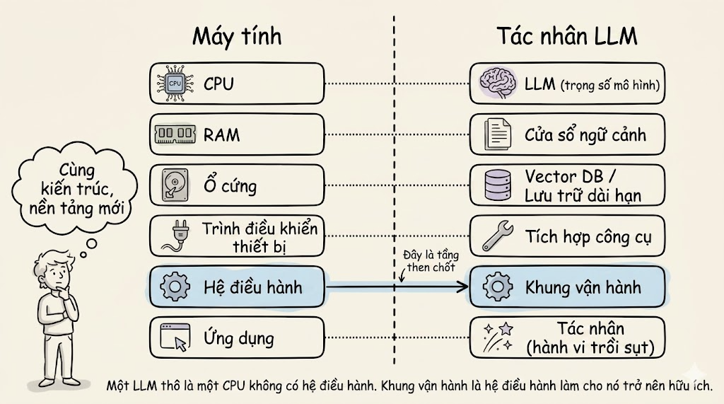 Mô hình không còn là nơi duy nhất chứa trí thông minh nữa. Nó giờ hoạt động bên trong một hệ thống gồm: bộ nhớ lâu dài, kỹ năng có thể tái sử dụng, các giao thức tiêu chuẩn (như MCP và A2A), môi trường thực thi an toàn, các bước phê duyệt và lớp theo dõi/giám sát hoạt động.