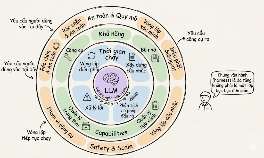 Nếu có harness, thì bộ nhớ lâu dài sẽ cung cấp ngữ cảnh, các file kỹ năng sẽ lưu quy ước làm việc, giao diện chuẩn hóa sẽ đảm bảo dữ liệu đúng cấu trúc, còn môi trường chạy sẽ sắp xếp các bước và xử lý lỗi.