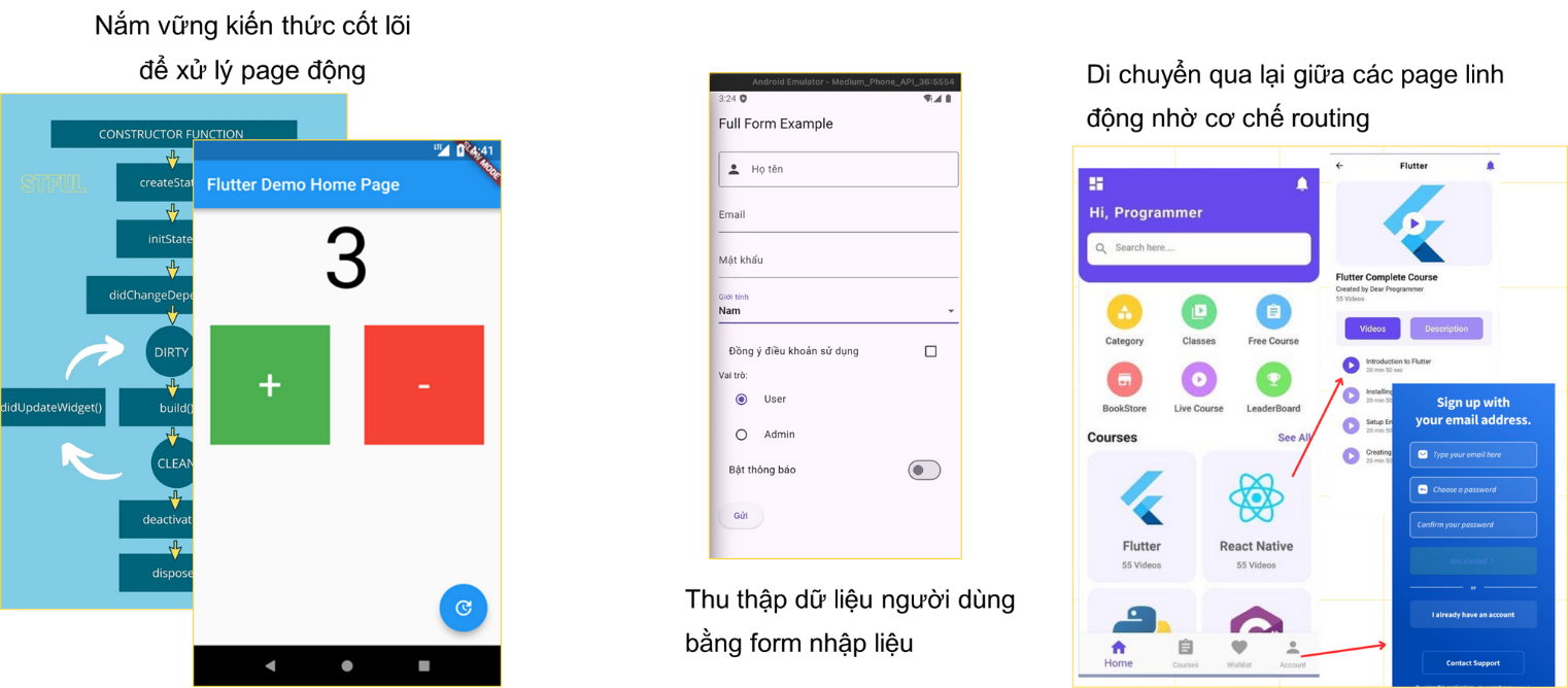 Chắc chắn! Flutter hỗ trợ phát triển ứng dụng với giao diện phức tạp, tính năng động và khả năng tương tác cao. Bạn sẽ học cách xây dựng các ứng dụng từ đơn giản đến phức tạp, bao gồm các tính năng như quản lý trạng thái, kết nối API, xử lý dữ liệu và nhiều kỹ thuật khác để đáp ứng yêu cầu thực tế.