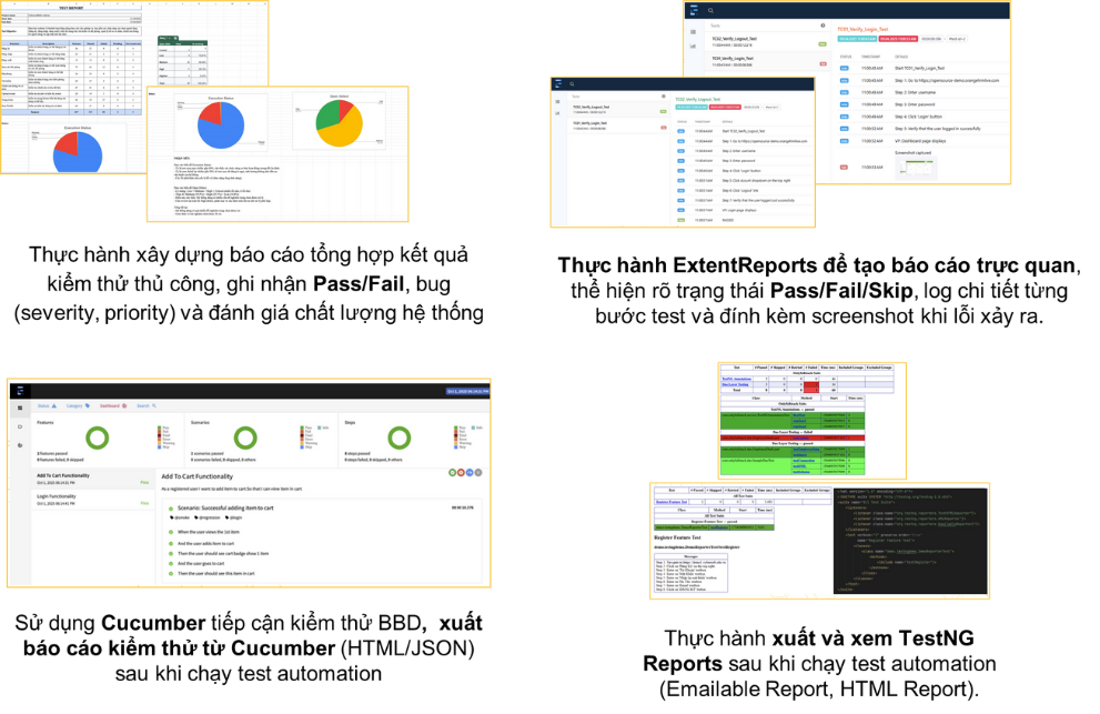 Trong khóa học, bạn sẽ được học tự động hóa kiểm thử (Automation Testing) với các công cụ phổ biến như Selenium, TestNG, và tích hợp các công cụ AI Testing để tối ưu hóa quy trình kiểm thử. Bạn cũng sẽ thực hành qua các dự án thực tế để củng cố kỹ năng kiểm thử của mình, từ đó tự tin làm việc trong môi trường chuyên nghiệp.