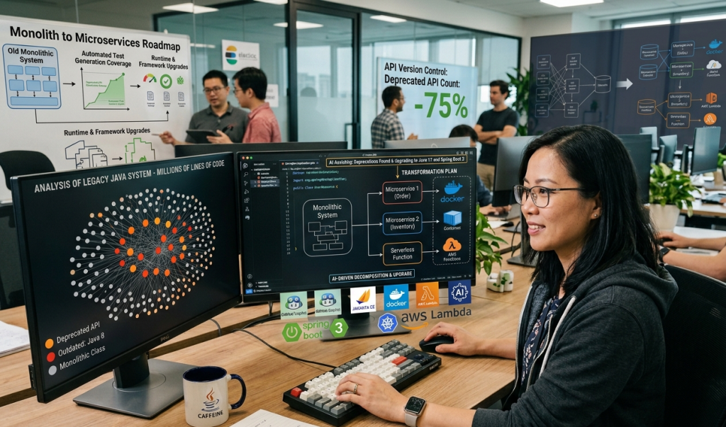 Chỉ riêng việc phân tích một hệ thống Java cũ có thể chứa hàng chục API đã lỗi thời, trải dài qua hàng trăm class và hàng triệu dòng code cũng có thể mất hàng tháng. Tuy nhiên, các công cụ AI có thể giúp lập bản đồ các mối phụ thuộc, phát hiện những phần đã lỗi thời, nâng cấp ứng dụng lên các phiên bản framework và runtime mới hơn, đồng thời tự động tạo test cho code và hỗ trợ chuyển đổi hệ thống monolithic sang kiến trúc microservices hoặc serverless.