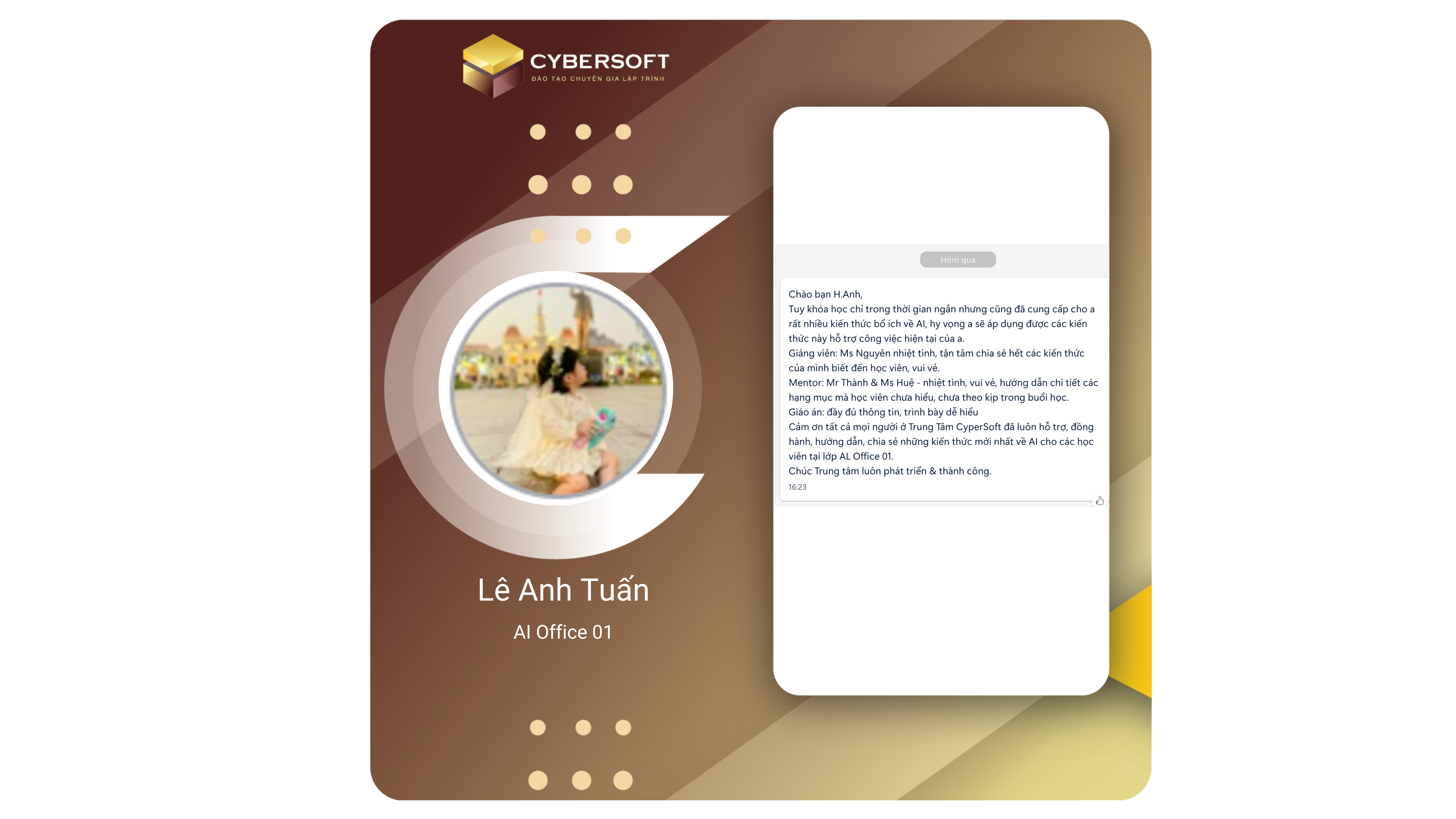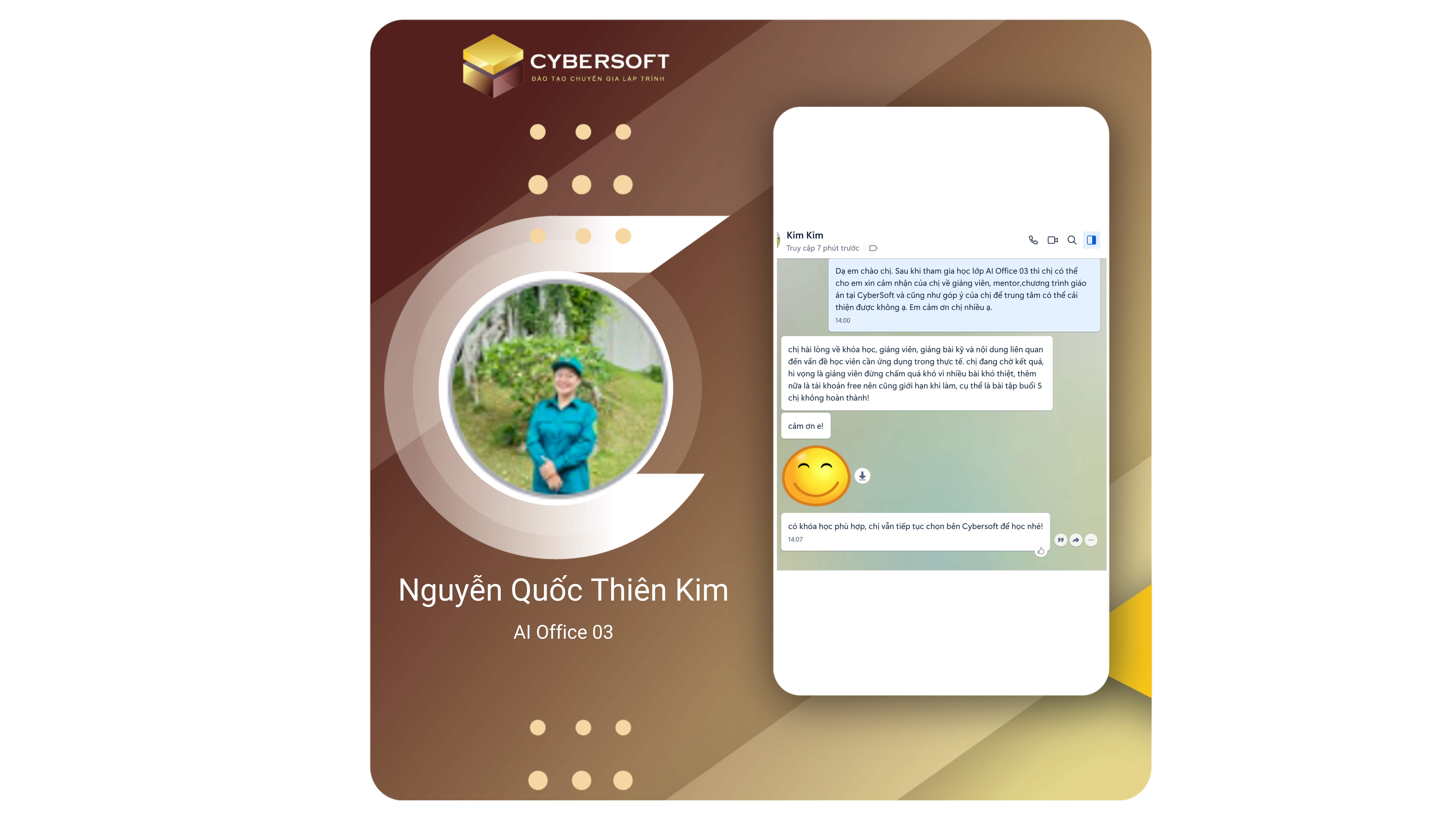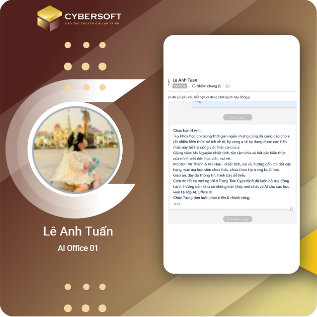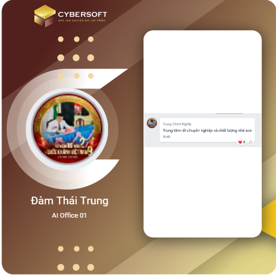 Chương trình học tại CyberSoft được xây dựng bài bản, kết hợp giữa lý thuyết và thực hành qua các dự án thực tế. Lộ trình rõ ràng từ cơ bản đến nâng cao, bao gồm các công nghệ hiện đại như ReactJS, TypeScript, NextJS và .NET... giúp học viên nắm vững kiến thức và ứng dụng linh hoạt vào công việc.